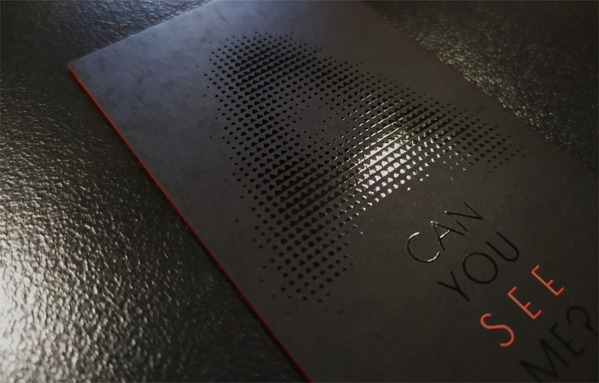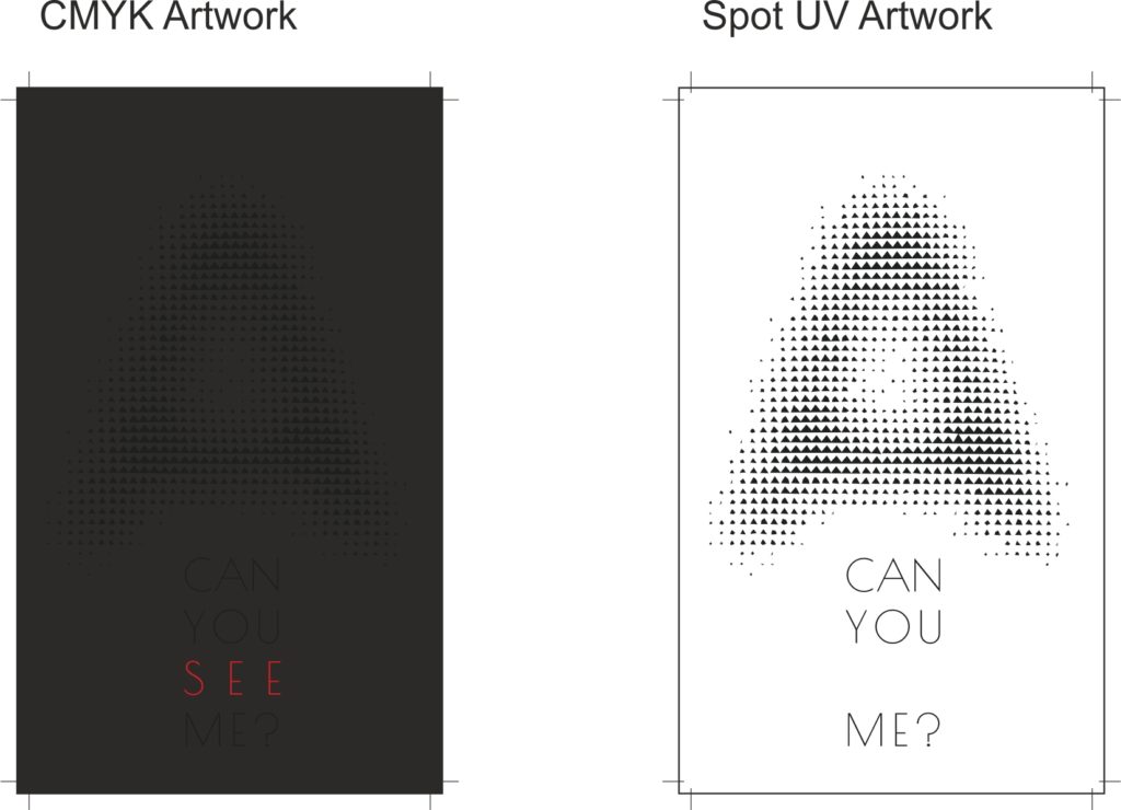 Text-content that is applied as Blind Spot UV may not be legible (as Spot UV is a clear layer). To read the text, it will need to catch the light in the right way – it may not be readable at all angles and under certain light.